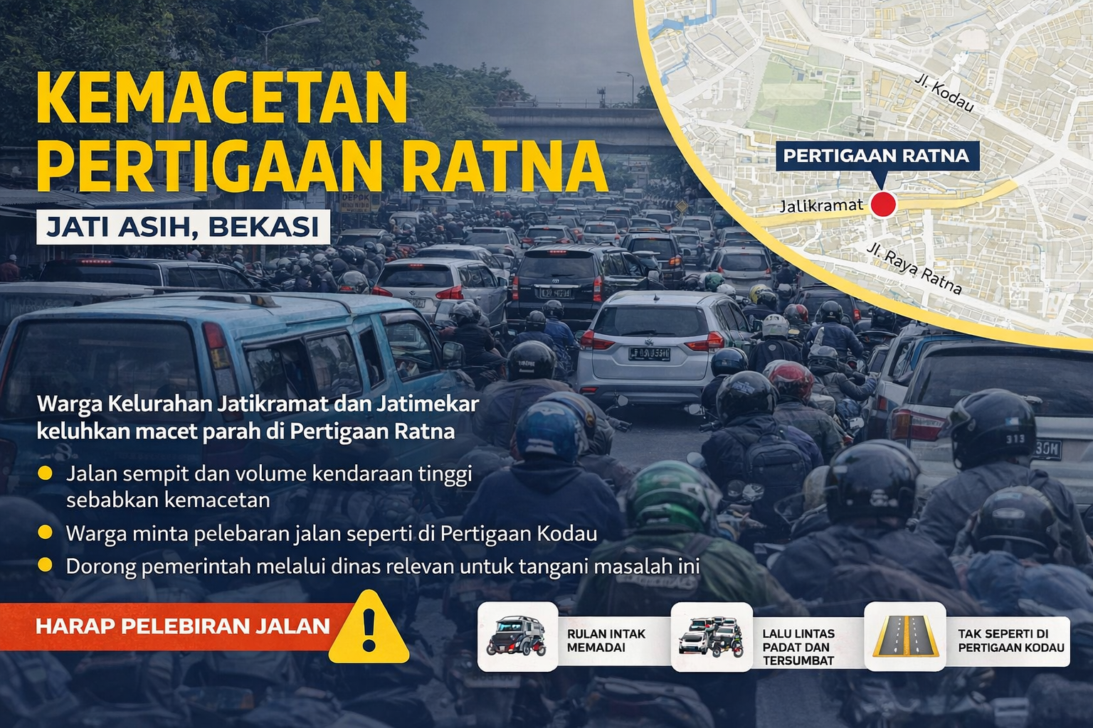 Warga meminta adanya pelebaran jalan, penataan ulang arus lalu lintas, serta penempatan petugas secara rutin di Pertigaan Ratna.